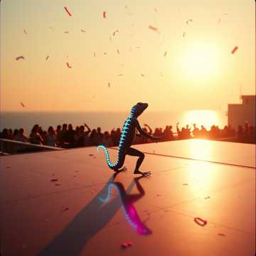 A cheerful, uplifting summer EDM / dance track with a warm, cinematic Disney-Pixar-like emotional tone. The song tells the story of a small gecko who dreams of dancing on a big festival stage by the seaside. The music starts soft and hopeful, then grows into an energetic festival drop full of joy, friendship, and adventure. Bright tropical synths, rhythmic claps, catchy vocal hook, feel-good melody, inspirational vibe, summer night atmosphere, positive, adventurous, heartwarming and playful. Suggested tags / style: EDM, dance pop, tropical, cinematic, uplifting, summer, animation vibe, inspirational Tempo (optional): 122–128 BPM Mood: joyful, emotional, adventurous, triumphant