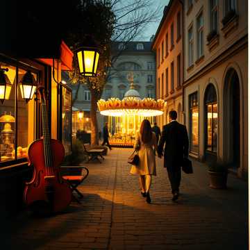 Acoustic street ensemble vibe: twin violins and a bright Viennese guitar trade lilting lines over a gently swaying waltz rhythm. Male vocals sit intimate and close, with subtle room reverb like a small Heuriger. Verses stay light and story-driven; chorus blooms with group sing-along responses and a hint of rustic accordion, building warmth rather than volume.