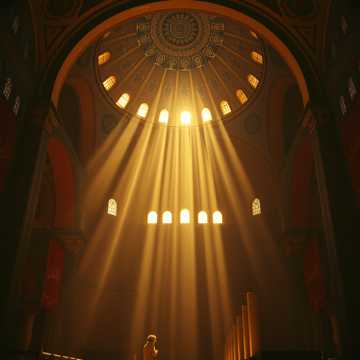Bei den Tuchhändlern begrüßte sie ein Meer aus Samt und Seide; schwere Ballen kostbarster Stoffe aus Purpur, der Farbe der Sultane und schimmernde zart glänzende Seide die wie flüssiges Gewebe durch die Finger gleitet. Tiefgrüner und tiefdunkel nachtblauer Samt und Brokat verteilen ihr schimmernd, geschecktes, gebrochenes Licht und schlucken in sich hinein das flackernd, spärliche, ölig, rusige Licht der Öllampen, während die goldbestickten Brokate Geschichten aus fernen Ländern erzählen. Sie durchschritten das riesige Eingangstor der Hagia Sofia und ein Lichtermeer aus Gold, Silber, reinster funkelnder Edelsteine und reinem eingefangenen Licht tat sich vor ihnen auf; es fühlte sich an als würden sie den Mittelpunkt; das Zentrum des Universums betreten, so hell leuchtete das Licht, es ward eine Sternen Explosion. Sie standen inmitten der riesigen Himmelshalle und konnten ein Ende nicht entdecken; die Himmels Kuppel reicht samt Gewölbe bis in die Unendlichkeit des Himmels Höhen und ward so von goldenen Licht durchflutet daß man schon meinte das die Augen einem einen Streich spielten. Aber so Langsam hatten sie sich an das göttliche Licht gewöhnt und man konnt erkennen um was es hier geht und wie schön verziert diese Himmels Halle war. Feinste arabische Schriften waren an den Wänden eingraviert wie eintätowiert und leuchteten Goldlack schwarz und grüngolden Gelb und reichten in vielen Kalligrafischen Mustern und Ornamenten bis in des Himmels Höhen und viele Engel und Heilige waren zu bestaunen; viel Pomp und Prunk dachten sich die in Glaubens Dingen bescheidenen und toleranten Steppenkrieger; Rostam kannte das schon aus anderen Nah östlichen Kulturen. Die Dimensionen der Himmels Halle waren Ehrfurcht gebietend; viele Tausende von Gläubigen konnten hier Platz finden, vereint unter dem gigantischen, göttlichen Himmels Baldachin aus Stein und Gold. Der einzigartige Lichteinfall schuf eine spirituelle Aura von erfüllter, gemeinschaftlich erlebter liturgischer himmlischer Erfülltheit und spiritueller Qualität wie sie auf ähnliche weise wohl nur am höchsten Punkt der menschlich Menschenwesen Welt, dem heiligen Berg des Altai; auf der Spitze des Bergs Öteken auf dem Dach der Welt wo sich Himmel und Erde berühren zu finden ist.