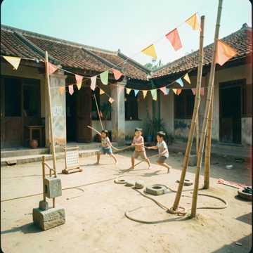 [Verse 1] Ra sân đình Trời xanh trong veo Cờ bay bay Trống vang reo reo Bạn nắm tay Cười vang sân gạch Gọi nhau ra chơi Quên luôn ăn chiều