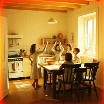 [Vers] Niklas vid bordet Med mjöl på sin kind Tila och Rakel De skrattar i vind Jonna i köket Hon vispar i takt Ella och Meija Med skratt som är packat