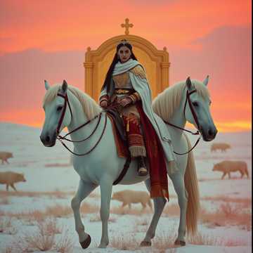 In der Mutters Jurte wurde eifrig Yak Filz gewalgt, gedrückt, gestreckt und gezogen und mit hunderter kleinster schöner Hirsch und Wolfs Symbolen bestickt und eingewoben. Der Verlobungs Kopfschmucks Brauthut war über und über mit Edelsteinen eingefasst und verziert und fast einen halben Meter groß und hatte feinste; leichtig, schwebend Kranichfedern eingewebt und war ein Kunstwerk ähnlich wie es heute noch die Kirgiesen tragen. Das Fest begann: Der Stamm der zehn Pfeile On Ök Türken, Karluken und Kiptschaken sowie die Uiguren und Töll`isch Türken saßen hoch zu Ross und bildeten den Zugangskorridor zu dem hoh`n goldenen Thron auf dem Asena in der Mitte und daneben ihre Eltern saßen; in vollem Kök Türkler Kriegsgewand; auch die Frauen waren Kriegerinnen; daß hatten sie sich von den Skythen abgeschaut; und Osman voran mit seinem ganzen Clan auf sie zuritt und vor ihnen auf die Knie ging und sein Schwert Alp Er Tunga Bam`se Beyrek Tamerlan Tarras Bulba Khan in die Hände gab; was bedeutet daß alle Kök Türkler Türk`mehnen Stämme jetzt die Hälfte des Weidelands des Skythen und Oghusen Khaganats ihr eigen nennen; und bat kiss isteme zu halten und um ihrer Tochter Hand anzuhalten dürfen. Ein wilder Jubel brach aus; die Kök Türkler Türk`mehnen waren gar nicht mehr zu halten; nun hatten sie endlich was sie schon so lange haben wollten und waren Teil der großen Allianz aller Steppenkrieger Reitervölker diesseits des Magyarenlands bis jenseits des Altai`s. Siebentausend Kilometer freies Steppenkrieger Land und alle reiten unter einer Fah`n; so hatten es sich Bulba Kahn und Dschingis Khan der Groß Khan aller Groß Khane; Herrscher des unendlichen Ozeans und des ewiglich blauen Himmels es sich immer vorgestellt. Dann bat Osman Khan die Brautmutter Süt Hakk`e; die Melkrecht Vergabe zu halten und Seldschuk und die tapferen Skythen und Oghusen Krieger trieben zweitausend edelster Yak Milchkühe zum Hochzeitsplatz; dies war ein spezielles Geschenk für die Mutter der Braut um die Mühen der Aufziehung der Kinder zu ehren. Asena trug über ihrem Leder Metall Plätchen Panzer einen mehrfach geschlagenen weißen Brokat Bindall`e Kaftan mit acht Meter langem mehrfach umschlungenen weißen aus aller dünnster Seide gewirkten Prunk Schal der wie Schneeflocken im Wind schwebte. Auf ihren Schultern ein mächtger Hermelin und reinster Zobel Mantel thronte; festgehalten mit massiven Goldschließen. Ich bin Par Aghaba die Feder des Adlers und wenn der Skythen Greife ihre Flügel in der Steppe Höhen schwingen wird bald des Todes Lied erklingen. Par Aghaba und Bulba Kahn Par Aghaba und Bulba Kahn Par Aghaba und Bulba Kahn Par Aghaba und Bulba Kahn Nun begann das Buss`Kaschi ein wirklich wilder intensiver Reiterkampf; die jungen Männer kämpften wie die Wilden um den Schafsbalg ohne Kopf und Eingeweide und zerrten und rissen im vollen Galopp den Kadaver mehrfach entzwei; eine entlaufene Ziege verirrte sich auf den Kampfplatz; die wurde gleich mitgejagt; bis Asena die Wölfin das sah und von hinten in vollem Tempo angerannt in vollem Hochzeitsornat auf ihren wilden Steppenhengst sprang und ohne Sattel aus dem Stand in vollem Galopp davon stob und Par Aghaba gleich mit von hinten aufsprang und die kleine arme völlig verwirrte und schockierte Ziege in vollem Galopp nach unten greifend am Genick packte und sie wieder in einem Stück und ganz heile nachHause brachte. Die kleine Ziege war aber so treu und anhänglich daß sie nicht mehr von Asenas und Par Aghabas Seite wich; die drei amüsierten sich den ganzen Abend lang prächtig. Ich bin Par Aghaba die Feder des Adlers und wenn der Skythen Greife ihre Flügel in der Steppe Höhen schwingen wird bald des Todes Lied erklingen. Par Aghaba und Bulba Kahn Par Aghaba und Bulba Kahn Par Aghaba und Bulba Kahn Par Aghaba und Bulba Kahn Par Aghaba und Bulba Kahn Par Aghaba und Bulba Kahn Par Aghaba und Bulba Kahn Par Aghaba und Bulba Kahn. Par Aghaba und Bulba Kahn… Par Aghaba und Bulba Kahn Par Aghaba und Bulba Kahn Par Aghaba und Bulba Kahn Par Aghaba und Bulba Kahn. Par Aghaba und Bulba Kahn…