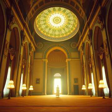 Bei den Tuchhändlern begrüßte sie ein Meer aus Samt und Seide; schwere Ballen kostbarster Stoffe aus Purpur, der Farbe der Sultane und schimmernde zart glänzende Seide die wie flüssiges Gewebe durch die Finger gleitet. Tiefgrüner und tiefdunkel nachtblauer Samt und Brokat verteilen ihr schimmernd, geschecktes, gebrochenes Licht und schlucken in sich hinein das flackernd, spärliche, ölig, rusige Licht der Öllampen, während die goldbestickten Brokate Geschichten aus fernen Ländern erzählen. Sie durchschritten das riesige Eingangstor der Hagia Sofia und ein Lichtermeer aus Gold, Silber, reinster funkelnder Edelsteine und reinem eingefangenen Licht tat sich vor ihnen auf; es fühlte sich an als würden sie den Mittelpunkt; das Zentrum des Universums betreten, so hell leuchtete das Licht, es ward eine Sternen Explosion. Sie standen inmitten der riesigen Himmelshalle und konnten ein Ende nicht entdecken; die Himmels Kuppel reicht samt Gewölbe bis in die Unendlichkeit des Himmels Höhen und ward so von goldenen Licht durchflutet daß man schon meinte das die Augen einem einen Streich spielten. Aber so Langsam hatten sie sich an das göttliche Licht gewöhnt und man konnt erkennen um was es hier geht und wie schön verziert diese Himmels Halle war. Feinste arabische Schriften waren an den Wänden eingraviert wie eintätowiert und leuchteten Goldlack schwarz und grüngolden Gelb und reichten in vielen Kalligrafischen Mustern und Ornamenten bis in des Himmels Höhen und viele Engel und Heilige waren zu bestaunen; viel Pomp und Prunk dachten sich die in Glaubens Dingen bescheidenen und toleranten Steppenkrieger; Rostam kannte das schon aus anderen Nah östlichen Kulturen. Die Dimensionen der Himmels Halle waren Ehrfurcht gebietend; viele Tausende von Gläubigen konnten hier Platz finden, vereint unter dem gigantischen, göttlichen Himmels Baldachin aus Stein und Gold. Der einzigartige Lichteinfall schuf eine spirituelle Aura von erfüllter, gemeinschaftlich erlebter liturgischer himmlischer Erfülltheit und spiritueller Qualität wie sie auf ähnliche weise wohl nur am höchsten Punkt der menschlich Menschenwesen Welt, dem heiligen Berg des Altai; auf der Spitze des Bergs Öteken auf dem Dach der Welt wo sich Himmel und Erde berühren zu finden ist.