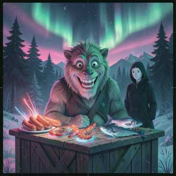 Mitt ute i skogen där vettet tar slut Står Janne och gormar: “Kom hit för i helvete!” Med räkor och korv och fisk som fan Och rökt fläsk så bra att man nästan blir galen ibland