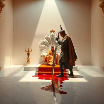 Akbar ward immer noch langweilig; doch plötzlich tat sich was im Palast; Schreie, Kampfgeräusche waren zu vernehmen; Waffen klirrten. Akbar saß immer noch auf seinem Pfauenthron. Sein Enkel Aurangzeb trat in die riesige Palasthalle ein, bis an die Zähne bewaffnet. Endlich tat sich was im Palast, dacht sich Akbar, der sich ein bißchen schlapp und müde fühlte vom vielen Pfauenthron sitzen und sich am liebsten gleich wieder ins Bett legen wollte; aber das ist ja auch langweilig dacht er sich und so blickte er Aurangzeb mitten ins Gesicht und in dessen vor Hass und Ehrgeiz funkelnden Aug´n. An seiner Säbel Klinge tropfte das Blut nur so herunter und hatte in der andren Hand den mächtgen Katar Faustdolch mit deltaförmiger Klinge und hob die Faust mit dem Blut triefenden Dolch: Um Gnade nicht gebeten noch gegeben noch verwehrt und stieß ihm den Dolch mitten ins Herz. Endlich hat das alles ein End, dacht sich Akbar als er nach längerem warten in des Paradieses Himmels Pforte eintritt. Endlich nun war Aurangzeb an der Macht; er hatte Akbar seinen Großvater ermordet und seinen Vater Schah Tscha Han für den Rest seines Lebens in das rote Fohr von Agrar eingesperrt. Die Schlachtreihen der Radsch´puten waren in langer breiter Formation aufgestellt und sie blickten stolz und Todes verachtend von ihren edlen weißen Schlacht Rössern herab und in weiter Ferne ward tosend das Getrommel der Pauken und Trompeten zu vernehmen; der Feind näherte sich langsam, stetig und unaufhaltsam. Der Radsch´puten Kettenhemd Rüstungen funkelten und blitzten in des Morgens früher Stund und die Sonne begrüßte die todesmutigen Helden in herrlichem orangen rot. Par Aghaba ward voll in ihrem Element. Ich bin Par Aghaba die Feder des Adlers und wenn der Skythen Greife ihre Flügel in der Steppe Höhen schwingen wird bald des Todes Lied erklingen. Par Aghaba und Bulba Kahn Par Aghaba und Bulba Kahn Par Aghaba und Bulba Kahn Par Aghaba und Bulba Kahn. Manche trugen den Kriegsmantel der tausend Nägel; diese Rüstung bestand aus Stoff oder Samt in das tausende von Stahlplatten ein´genietet waren. Jeder Krieger trug den legendären Katar Stoßdolch am Gürtel dessen Hah förmiger Faustgriff weit über die reich und bunt verzierten Dolchschalen hinausragte und so geführt wurde, daß die Klinge eine Verlängerung des Unterarms bildete, was kraftvolle Stoßbewegungen ermöglichte und Tod und Verderben brachte wenn diese Klingen anfingen auf dem Schlachtfeld zu singen. Ihre weltbekannten und gefürchteten, gekrümmten Talwar Radsch´puten Säbel mit leicht geschwungener zweischneidiger Klinge; waren lang und schmal und blitzschnelle Waffen; Rasiermesser scharf und tödlich geschliffen; und tausendfach durchoptimiert, für tödlichste Hieb und Schnitt Angriffe; und ein runder großer Buckelbauch Schild; aus Stahl oder Nashornhaut gefertigt wurde zum Schutz oder Schieben und Stoßen verwendet. Das schwere, zweischneidige Khanda Breitschwert mit abgerundeter flacher Spitze konnte kraftvolle Schläge im Nahkampf austeilen und mit einem Hieb einen Menschen in zwei Stücke zerteilen. Ihre Bhala Speere waren lang und schwer und von enormer Durchschlagskraft und konnten geworfen oder auch zum stechen oder stoßen verwendet werden und waren die primär Waffe bei Kavallerie Angriffen um gegner´ische Linien zu durchbrechen. Die scharf geschliffenen zweiflügligen Blätterspitzen drangen tief ein in der Feinde Körper und konnten genauso schnell auch wieder herausgezogen werden. Ihre langen nach oben gezogenen Spitz Eisenhelme waren rundum mit einem Gesichts und Nackenschutz aus Kettengliedern versehen und boten auch unter härtesten Nahkampf Bedingungen gute rundum Sicht; so waren sie immer Herr des Geschehens. Par Aghaba bestaunte die hoch effiziente Waffentechnik. Ich bin Par Aghaba die Feder des Adlers und wenn der Skythen Greife ihre Flügel in der Steppe Höhen schwingen wird bald des Todes Lied erklingen. Par Aghaba und Bulba Kahn Par Aghaba und Bulba Kahn Par Aghaba und Bulba Kahn Par Aghaba und Bulba Kahn Par Aghaba und Bulba Kahn Par Aghaba und Bulba Kahn Par Aghaba und Bulba Kahn Par Aghaba und Bulba Kahn. Par Aghaba und Bulba Kahn… Par Aghaba und Bulba Kahn Par Aghaba und Bulba Kahn Par Aghaba und Bulba Kahn Par Aghaba und Bulba Kahn. Par Aghaba und Bulba Kahn…