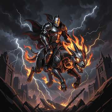 Fémszörny hátán ül, mely lángot lehel,