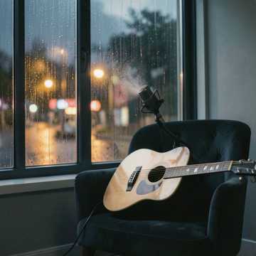folk, Intimate acoustic ballad in minor key, male vocals. Close-mic guitar with soft fingerpicking, subtle rain ambience and low room reverb. Verses stay hushed and conversational; chorus opens with doubled vocal, gentle backing harmonies, and a warm, compressed low-end bloom. Light shaker and distant piano notes enter on second chorus to lift energy, then everything pulls back to bare vocal and guitar on the final line., sleep, loud, acoustic, soft, deep