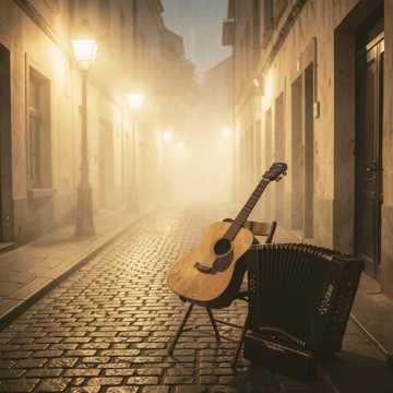 folk, Theatrical street ballad with raw male vocals; intimate acoustic guitar at center, close-mic’d, fingers squeaking on strings. Light accordion swells like a distant alley, strings enter in the chorus for emotional lift. Verses stay narrow and whispered, chorus blooms with wider vibrato and subtle gang-style harmonies on key lines. Performance leans on spoken-sung drama, breaths and cracks left in the mix for realism., italian folk, accordion, acoustic, emotional, musical, vocal, light, minimal, tone, raw