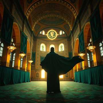 Bei den Tuchhändlern begrüßte sie ein Meer aus Samt und Seide; schwere Ballen kostbarster Stoffe aus Purpur, der Farbe der Sultane und schimmernde zart glänzende Seide die wie flüssiges Gewebe durch die Finger gleitet. Tiefgrüner und tiefdunkel nachtblauer Samt und Brokat verteilen ihr schimmernd, geschecktes, gebrochenes Licht und schlucken in sich hinein das flackernd, spärliche, ölig, rusige Licht der Öllampen, während die goldbestickten Brokate Geschichten aus fernen Ländern erzählen. Sie durchschritten das riesige Eingangstor der Hagia Sofia und ein Lichtermeer aus Gold, Silber, reinster funkelnder Edelsteine und reinem eingefangenen Licht tat sich vor ihnen auf; es fühlte sich an als würden sie den Mittelpunkt; das Zentrum des Universums betreten, so hell leuchtete das Licht, es ward eine Sternen Explosion. Sie standen inmitten der riesigen Himmelshalle und konnten ein Ende nicht entdecken; die Himmels Kuppel reicht samt Gewölbe bis in die Unendlichkeit des Himmels Höhen und ward so von goldenen Licht durchflutet daß man schon meinte das die Augen einem einen Streich spielten. Aber so Langsam hatten sie sich an das göttliche Licht gewöhnt und man konnt erkennen um was es hier geht und wie schön verziert diese Himmels Halle war. Feinste arabische Schriften waren an den Wänden eingraviert wie eintätowiert und leuchteten Goldlack schwarz und grüngolden Gelb und reichten in vielen Kalligrafischen Mustern und Ornamenten bis in des Himmels Höhen und viele Engel und Heilige waren zu bestaunen; viel Pomp und Prunk dachten sich die in Glaubens Dingen bescheidenen und toleranten Steppenkrieger; Rostam kannte das schon aus anderen Nah östlichen Kulturen. Die Dimensionen der Himmels Halle waren Ehrfurcht gebietend; viele Tausende von Gläubigen konnten hier Platz finden, vereint unter dem gigantischen, göttlichen Himmels Baldachin aus Stein und Gold. Der einzigartige Lichteinfall schuf eine spirituelle Aura von erfüllter, gemeinschaftlich erlebter liturgischer himmlischer Erfülltheit und spiritueller Qualität wie sie auf ähnliche weise wohl nur am höchsten Punkt der menschlich Menschenwesen Welt, dem heiligen Berg des Altai; auf der Spitze des Bergs Öteken auf dem Dach der Welt wo sich Himmel und Erde berühren zu finden ist.