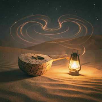 Sparse oud and rababah over a slow, sandy groove; male vocals up-close and raw, with a call-and-response echo in the hook. Verses stay low and cracked, chorus swells with stacked desert chants and frame drum pulses, then drop back to a hush on the last line.