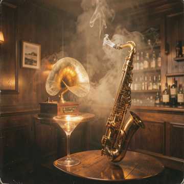 Laid‑back 1940s bar jazz, brushed swing kit, warm upright bass, smoky sax lead trading phrases with soft male vocals. Piano comps sparsely in the verses; chorus opens with lush extended chords and close-room reverb. Intimate, low-volume performance, spotlight on the horn, vocal almost murmured at the mic, perfect for a late set in a dim speakeasy.