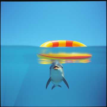 Miguel et Selena jouent au ballon, Luna tente de monter sur le matelas gonflable et Lucie rigole Dans la piscine il y a un dauphin dans le fond qui regarde toute la famille s'amuser. Il fait beau et la piscine est chauffée. Pendant ce temps Karine les regarde en rigolant !