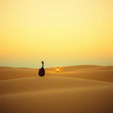 Emotional Gulf sheila with male vocals in a deep register, drenched in plate-style echo reverb over airy desert ambience. Light tar and finger snaps carry a slow sway, with subtle oud phrases answering the vocal lines. Verses stay intimate and close-mic’d; chorus opens with stacked harmonies and a wider stereo field, riding a proud, uplifting arc that still feels fragile and heartfelt., emotional, light, vocal, deep