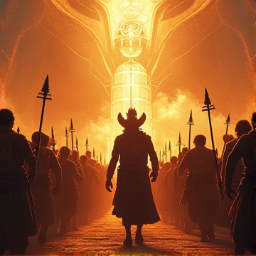 Epic tribal sheela with heroic male vocals, fast tempo. Heavy martial drums drive the groove under bold oud lines and a sweeping orchestral bed with brass swells and deep choirs. Verses stay tight and percussive; chorus explodes with stacked gang-style shouts answering the lead. Gradual build in intensity toward a final, drawn-out refrain with pounding hits and a unison shout ending.