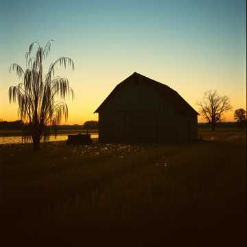 The sun dips low behind the barn