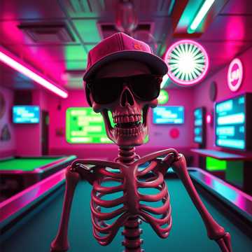 Скелет смеется, в бейсболке, в очках,
