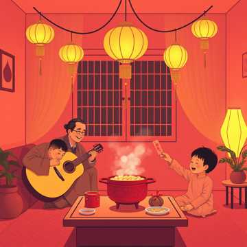 Warm acoustic pop with a light spring festival groove; nylon guitar and soft bass carrying a gentle swing. Verses stay intimate with close-mic vocals and subtle shaker; chorus widens with group “ô hô” responses, bright plucks, and playful percussion. Energy rises each generation, ending in a joyful family singalong feel.