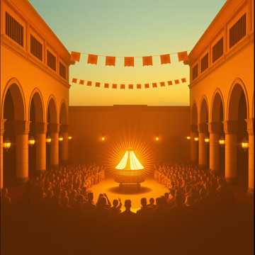 Majestic Arabic pop celebration with male vocals, bold tabla and riq groove, sweeping strings and brass stabs. Verses start almost spoken-shouted over a driving rhythmic bed; chorus explodes with high, powerful belting and group shouts. Bridge drops to claps, deep drones, and call-and-response chants, then full-band finale with octave-doubled lead and jubilant ad-libs.