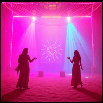 Upbeat Arabic pop with North African percussion groove, bright qanun riffs, and bouncy bass. Verses stay tight and rhythmic with claps and group shouts; chorus explodes with doubled female vocals, call‑and‑response ad-libs, and big synth stabs. Short bridge strips to drums and vocal hook before a final high-energy chorus.