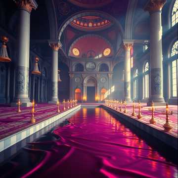Bei den Tuchhändlern begrüßte sie ein Meer aus Samt und Seide; schwere Ballen kostbarster Stoffe aus Purpur, der Farbe der Sultane und schimmernde zart glänzende Seide die wie flüssiges Gewebe durch die Finger gleitet. Tiefgrüner und tiefdunkel nachtblauer Samt und Brokat verteilen ihr schimmernd, geschecktes, gebrochenes Licht und schlucken in sich hinein das flackernd, spärliche, ölig, rusige Licht der Öllampen, während die goldbestickten Brokate Geschichten aus fernen Ländern erzählen. Sie durchschritten das riesige Eingangstor der Hagia Sofia und ein Lichtermeer aus Gold, Silber, reinster funkelnder Edelsteine und reinem eingefangenen Licht tat sich vor ihnen auf; es fühlte sich an als würden sie den Mittelpunkt; das Zentrum des Universums betreten, so hell leuchtete das Licht, es ward eine Sternen Explosion. Sie standen inmitten der riesigen Himmelshalle und konnten ein Ende nicht entdecken; die Himmels Kuppel reicht samt Gewölbe bis in die Unendlichkeit des Himmels Höhen und ward so von goldenen Licht durchflutet daß man schon meinte das die Augen einem einen Streich spielten. Aber so Langsam hatten sie sich an das göttliche Licht gewöhnt und man konnt erkennen um was es hier geht und wie schön verziert diese Himmels Halle war. Feinste arabische Schriften waren an den Wänden eingraviert wie eintätowiert und leuchteten Goldlack schwarz und grüngolden Gelb und reichten in vielen Kalligrafischen Mustern und Ornamenten bis in des Himmels Höhen und viele Engel und Heilige waren zu bestaunen; viel Pomp und Prunk dachten sich die in Glaubens Dingen bescheidenen und toleranten Steppenkrieger; Rostam kannte das schon aus anderen Nah östlichen Kulturen. Die Dimensionen der Himmels Halle waren Ehrfurcht gebietend; viele Tausende von Gläubigen konnten hier Platz finden, vereint unter dem gigantischen, göttlichen Himmels Baldachin aus Stein und Gold. Der einzigartige Lichteinfall schuf eine spirituelle Aura von erfüllter, gemeinschaftlich erlebter liturgischer himmlischer Erfülltheit und spiritueller Qualität wie sie auf ähnliche weise wohl nur am höchsten Punkt der menschlich Menschenwesen Welt, dem heiligen Berg des Altai; auf der Spitze des Bergs Öteken auf dem Dach der Welt wo sich Himmel und Erde berühren zu finden ist.