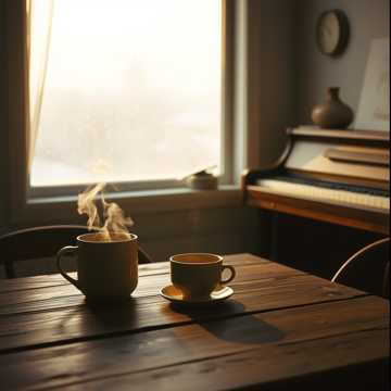 Polish cozy winter morning song about coffee as a daily ritual. Warm, intimate, nostalgic atmosphere. Soft piano, gentle acoustic guitar, subtle lo-fi beats, light background strings. Female vocal, tender and close, slightly sleepy tone. Tempo slow to mid (70–85 BPM). Mood calm, comforting, reflective, like watching snowfall through a window at dawn. Steam from a mug, quiet kitchen, world not awake yet. Chorus emotional and warm, building slightly but staying soft. Organic, minimal production, café vibe, vinyl crackle texture.cozy acoustic, winter morning, soft female vocal, lo-fi folk, warm piano, intimate, calm, nostalgic