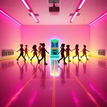 Bouncy kids-fitness pop with bright synth leads, playful FX, and steady marching kick. Female vocals, call-and-response energy; verses ride a tight, percussive groove, chorus bursts wider with stacked group chants and claps. Occasional robotic vocal drops for the AI character, ending with a triumphant, slightly faster reprise.