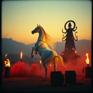 Ba´ha´dur der Ti´ger von Radschan´pur stand auf und stieg auf seinen edlen weißen Radsch´puten Kriegs Hengst und zog seinen heiligen Kata Dolch: So laßt und beginnen mit den heiligen Ritualen und uns vorbereiten auf die Schlacht; wir werden brechen der Mogul Kaiser Macht und bis in die Unendlichkeit an eurer Seite reiten du Mutter aller Völker. Das Kriegsritual begann: In der Stunde, in der das Purpur der Dämmerung auf die schroffen, spitzen Zinnen der Wüstenfestung traf, verwandelte sich das Lager der Radsch´puten in einen Vorhof zwischen den Welten. Die Luft ward schwer vom herben Duft von brennendem Sandelholz und dem metallischen Odem blankgeputzten Stahls. Wenn die Krieger die Götter befragten, begann das Schweigen der Wüste zu singen. Es begann das Erwachen des Stahls; die heilige Klinge wurde angerufen. Zuerst neigten sich die Fürsten vor dem Schastra Pu´tscha, der Anbetung der Waffen. Die Talwaren und Dolche wurden nicht als totes Eisen, sondern als Gefäße göttlicher Kraft betrachtet. In tiefer Medi´ tation saßen die Krieger vor ihren blanken Klingen, die im Fackelschein wie tödliche, eingefrorene Blitze zuckten. Sie benetzten den Stahl mit heiligem Gangeswasser und zeichneten mit rotem Kumkum Pulver das Zeichen der Tilaka auf die Rasiermesser scharfe Schneide; ein rituelles Versprechen, daß dieses Eisen nur für die Ehre und den Schutz der göttlichen Weltordnung, Dharma singen würde. Das Orakel des Feuers begann…! Vor dem Standbild der Durga, der schrecklich schönen Mutter des Krieges, entfachte der Brahmane das heilige Homa Feuer. Während die Flammen gierig nach den Opfergaben aus Butterfett und Getreide griffen, starrten die Krieger in das tanzende Licht. Man glaubte, dass die Art, wie der Rauch aufstieg oder wie das Feuer knisterte, die Stimme der Götter sei. Ein plötzliches Aufflackern galt als das Lächeln der Göttin; ein Zeichen, dass sie bereit war, auf den Schlachtfeldern menschlich Blut zu ernten. Par Aghaba ließ ebenfalls ihre Waffen weihen. Ich bin Par Aghaba die Feder des Adlers und wenn der Skythen Greife ihre Flügel in der Steppe Höhen schwingen wird bald des Todes Lied erklingen. Par Aghaba und Bulba Kahn