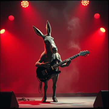 Epic rock music scene inspired by a Ukrainian song, a donkey playing electric guitar with horns on its head, standing on a smoky concert stage, dynamic lighting with colorful spotlights, energetic cro