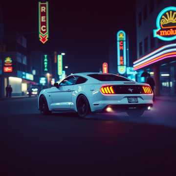 A Mustang sunie jak cień — pewny siebie, dziki, w mroku.