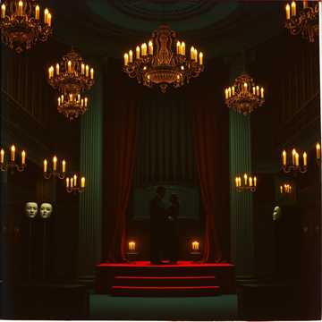 Epic, gothic theatrical musical in the style of Phantom of the Opera. Dark, dramatic orchestration with sweeping strings, pipe organ, choir, and haunting melodies. Emotional male and female duet vocals: longing, mystery, forbidden love, and tragedy. Lyrics about shadows behind velvet curtains, hidden passion, masks, chandeliers, candle-lit halls, and echoing voices. Slow–to–mid tempo, cinematic, majestic, operatic tension with powerful crescendos and whispered verses. Grand finale with soaring vocals and orchestral