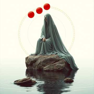 Но вернёмся к Рериха картине женщина с вуалью на лице сидит на камне воды омывают подножие ног а вокруг камни за головой три красные сферы или на рушнике
