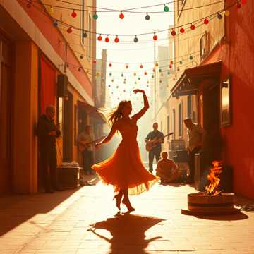 Gypsy swing jazz with upbeat dance tempo, female vocals. Bright acoustic guitars and nimble Django-style leads, upright bass walking hard, brushed snare driving a lilting groove. Verses stay playful and nimble, chorus explodes with stacked female harmonies and claps; short violin fills answer vocal phrases. Warm room reverb, close, charismatic vocal right in the listener’s ear.