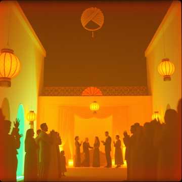 Warm Gulf-pop wedding song, midtempo groove with hand percussion, oud, and airy qanun lines; male vocals leading a big family chorus. Verse stays light and playful, chorus blossoms into call-and-response crowd chants and claps, with subtle strings swelling on the last hook for a joyful, celebratory lift.