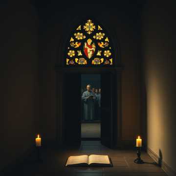 male low voice, monastic chant style, simple prayer chant, repetitive sacred melody, minimal instruments, slow build, distant male choir, reverent atmosphere, no pop song, no solo performance