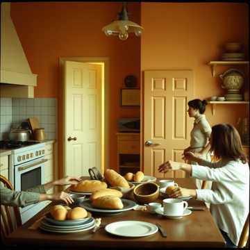 Warm acoustic pop with Mediterranean flair; nylon-string guitar and playful hand percussion set a busy family kitchen vibe. Male vocals up close and conversational in the verses, choruses open with group shouts and stacked harmonies. Occasional mandolin fills and claps underline arguments turning into laughter, big final chorus ending on a unison shout.