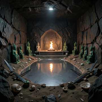 Diese prächtigen Landschaften im tiefstem Untergrund der Blut Püramid sollten den Ort der Schöpfung nachbilden und die Silber schimmernden Quecksilber Flüsse und Seen dienten der visuellen und rituellen Symbolik der streng religiösen Erbauer, die keine Kosten und Mühen gescheut; und hier eine verborgene Opferhöhle für machthungrige Blutpriester aus dem Berg schlugen, die seit hunderten vielleicht schon tausenden von Jahrn Massenmord unter dem Deckmantel ihrer Religion verübten und möglicherweise ging ihr Blutopfer Mord schon in die Million. Boudika nahm Seldschuk fest bei der Hand ihr wards doch sehr unheimlich zumut weil sie war keltisch sehr religiös und die Unterwelt war für die Kelten sowas wie eine Zwischenwelt die man betreten konnte durch Höhlen oder das Moor. Seldschuk wurds ganz warm ums Herz; mein Gott wie sehr liebte und begehrte er sie. Er ward absolut nicht religiös und doch hatte Amors Pfeil ihn mitten ins Herz getroffen. Er erwiderte ihre Geste und strich zärtlich und sanft über ihre Hand; wer hätte das gedacht; denn eigentlich ward er ein blutrünstiger Skythen und Oghusen Krieger. Sie gingen weiter und entdeckten hundert tausende von Opfergaben; darunter Jaguar und Adler Mumien, große Kautschuk Fußbälle die für das kriegerische, mörderische Hüftball Spiel dienten; bei der die Verlierer Mannschaft nachher den Göttern geopfert wurde oder gleich alle zwei Mannschaften Hingerichtet wurden, je nachdem wie es den Priestern gefiel. Und es gab hunderte von rätselhaften Goldkugeln; die aus Ton gefertigt und mit Pyrit Katzengold überzogen. Ihr genauer Zweck bleibt verborgen aber sie glänzten einst wie Sterne auf des Tunnels Boden. Tausende von Muscheln in allen Farben, einige davon kunstvoll graviert, schimmerten und leuchteten und wurden wohl aus der Karibik und dem Golf von Mexiko importiert. Sogar Krokodils Zähne waren an lange Jah´de Ketten gereiht und sie entdeckten sogar Wolfsmumien und riesige Mengen Jah´de und Bernstein Schmuck und tausende extrem scharfe, schwarze Obsidian Vulkan Glas Klingen und Knochen Pfeilspitzen waren dort zu finden. In einer rituellen Grube waren tausende bunter Blumen; auch Mais, Chili und Kaktusfeigen Samen waren noch erhalten geblieben; und dann fanden sie noch frische Blut tropfende Menschenhaut aber komplett am Stück, wie ein Menschenhaut Anzug mit Kopf, Torso und Gesicht; und sogar die Oberschenkel Haut ward noch dran mit reichlich bunter Federn ausgeschmückt. Das war sogar Seldschuk ein bißchen zu viel enthäuten menschlicher Haut. Par Aghaba musste sich fast übergeben. Ich bin Par Aghaba die Feder des Adlers und wenn der Skythen Greife ihre Flügel in der Steppe Höhen schwingen wird bald des Todes Lied erklingen. Par Aghaba und Bulba Kahn Par Aghaba und Bulba Kahn Par Aghaba und Bulba Kahn Par Aghaba und Bulba Kahn. Dort war der Ort wo sich Könige und Priester unter dem Einfluss Halluzinogener Pflanzengift Drogen den Rochen Stachel durch ihr Geschlechtsteil stießen um auch mal ein bißchen Blutopfer zu erbringen. Aber dass ward nichts im Vergleich dazu was sie ihren zum Blutopfer erwählten Opfern antaten. Dann kamen sie zu einer absolut dunklen sehr großen Höhlen Kammer wo nur in der Mitte ein Opferaltar mit dem ewigen Feuer des Lichts brannte. Dort hatten sie sich alle versteckt die unwürdigen, menschenverachtenden Massenmörder Priester. In jeder Ecke stand eine lebensgroße Götter Skulptur aus grüner edelster Jah´de und blickten wie tote Götzen auf die Mitte ins Zentrum ihres mörderischen Universums. Hier unten wurde Quetzal´koatl, die gefiederte Schlange angebetet. Sie hielten dort unten extrem hochgiftige gefiederte Schlangen und fütterten sie regelmäßig mit Opfertieren die qualvoll starben und die gefiederten Schlangen sie bei lebendigem Leib verschlangen. Boudika ließ Exkalibur singen und schwingen und mit einem Schwunges Streich, fünf Meter lang und Weit, flogen die hochgiftigen Schlangenköpfe samt der grausigen, spitzen, langen, Kanülen Giftzähne durch die Luft und bissen tief hinein in der Mordpriester ungeschützter Haut und Fleisch, sie zuckten und schnauften und rangen nach Luft unter entsetzlichen Schmerzen und Qualen, ein letztes Röcheln drang aus ihrem Mund und sie starben ganz langsam einen ehrlosen und fürchterlichen Tod. Seldschuk gab ihnen den Gnadenstoß, und enthauptete sie alle. Par Aghaba war froh dass der ganze Spuk vorbei war. Ich bin Par Aghaba Die Feder des Adlers und wenn der Skythen Greife ihre Flügel in der Steppe Höhen schwingen wird bald des Todes Lied erklingen. Par Aghaba und Bulba Kahn Par Aghaba und Bulba Kahn Par Aghaba und Bulba Kahn Par Aghaba und Bulba Kahn Par Aghaba und Bulba Kahn Par Aghaba und Bulba Kahn Par Aghaba und Bulba Kahn Par Aghaba und Bulba Kahn Par Aghaba und Bulba Kahn Par Aghaba und Bulba Kahn
