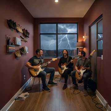 rock, Punchy mid-tempo rock with crunchy guitars and tight bass, male vocals in the verses and gang vocals in the hook, big tom fills into each chorus. First verse starts lean with palm-muted riffs, chorus explodes with open chords and stacked harmonies on the names. Brief breakdown before the last chorus with drums and voice only, then a final full-band hit and held chord.