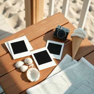 Instrumental cinematic vacation underscore, gentle and reflective, built for home-video montage with warm nylon-string guitar, soft brushed percussion, subtle marimba touches, sea-breeze pads, and a tender rise in the middle eight that feels like sunlight settling over old memories.
