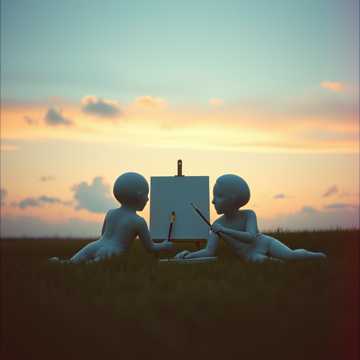 Dos pintores tirados en la grama haciendo un mismo cuadro