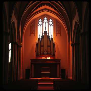 Cathedral-style classical piece for pipe organ and choir; slow, solemn 3/4 that swells from a single male vocal into full mixed chorus. Gentle pedal drones and soft principals in the verses, then broad, triumphant chords and echoing soprano lines in the chorus. Final cadence stretches with sustained choir and a high, shimmering organ registration.