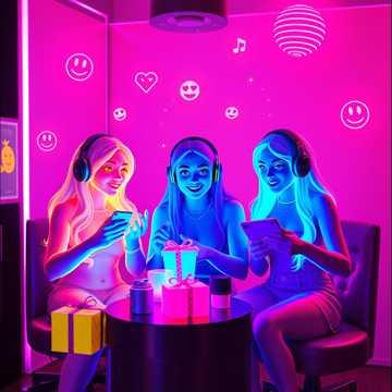 A high-energy pop-rock song about women having fun playing an online game called "Kiss and Meet." The lyrics tell the story of Galina (40), Svetlana (50), and Alena (46) who are best friends in the game, exchanging gifts, blasting music, and generally having a great time together. The song should be upbeat, positive, and make listeners want to dance. Use a female vocal.