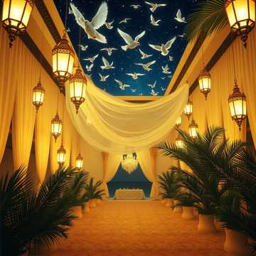 Warm Gulf wedding anthem in shila style, male vocals with wide group responses. Deep tribal percussion and handclaps drive a mid-tempo sway; verses stay spacious for lead poetry while the hook blossoms with call-and-response chants and octave harmonies. Subtle oud and airy synth pads underline the joy, with crowd-style ad-libs and ululations lifting each chorus.