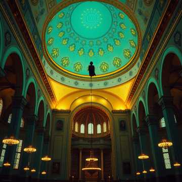 Bei den Tuchhändlern begrüßte sie ein Meer aus Samt und Seide; schwere Ballen kostbarster Stoffe aus Purpur, der Farbe der Sultane und schimmernde zart glänzende Seide die wie flüssiges Gewebe durch die Finger gleitet. Tiefgrüner und tiefdunkel nachtblauer Samt und Brokat verteilen ihr schimmernd, geschecktes, gebrochenes Licht und schlucken in sich hinein das flackernd, spärliche, ölig, rusige Licht der Öllampen, während die goldbestickten Brokate Geschichten aus fernen Ländern erzählen. Sie durchschritten das riesige Eingangstor der Hagia Sofia und ein Lichtermeer aus Gold, Silber, reinster funkelnder Edelsteine und reinem eingefangenen Licht tat sich vor ihnen auf; es fühlte sich an als würden sie den Mittelpunkt; das Zentrum des Universums betreten, so hell leuchtete das Licht, es ward eine Sternen Explosion. Sie standen inmitten der riesigen Himmelshalle und konnten ein Ende nicht entdecken; die Himmels Kuppel reicht samt Gewölbe bis in die Unendlichkeit des Himmels Höhen und ward so von goldenen Licht durchflutet daß man schon meinte das die Augen einem einen Streich spielten. Aber so Langsam hatten sie sich an das göttliche Licht gewöhnt und man konnt erkennen um was es hier geht und wie schön verziert diese Himmels Halle war. Feinste arabische Schriften waren an den Wänden eingraviert wie eintätowiert und leuchteten Goldlack schwarz und grüngolden Gelb und reichten in vielen Kalligrafischen Mustern und Ornamenten bis in des Himmels Höhen und viele Engel und Heilige waren zu bestaunen; viel Pomp und Prunk dachten sich die in Glaubens Dingen bescheidenen und toleranten Steppenkrieger; Rostam kannte das schon aus anderen Nah östlichen Kulturen. Die Dimensionen der Himmels Halle waren Ehrfurcht gebietend; viele Tausende von Gläubigen konnten hier Platz finden, vereint unter dem gigantischen, göttlichen Himmels Baldachin aus Stein und Gold. Der einzigartige Lichteinfall schuf eine spirituelle Aura von erfüllter, gemeinschaftlich erlebter liturgischer himmlischer Erfülltheit und spiritueller Qualität wie sie auf ähnliche weise wohl nur am höchsten Punkt der menschlich Menschenwesen Welt, dem heiligen Berg des Altai; auf der Spitze des Bergs Öteken auf dem Dach der Welt wo sich Himmel und Erde berühren zu finden ist.