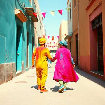 Upbeat Moroccan chaabi-pop groove, male vocals with bright melismatic hooks. Verses ride on playful bendir and groovy bass; chorus explodes with claps, layered call-and-response, and catchy melodic refrains. Short oud licks answer vocal lines, synth pads sneak in on pre-chorus to lift into a big singalong. Energetic, wedding-party feel with a wink of humor.