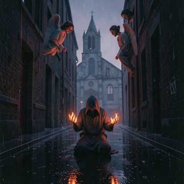 rap, Dark Hungarian rap/hip-hop, slow-rolling 78 BPM, cavernous sub-bass and detuned bells, sharp trap hats. Male vocals, low and gritty in verses, hook explodes with shouted doubles and distant choral pads hinting at sacred choirs. Beat stays minimal first half, grows with distorted 808 glides, reverse sweeps, and eerie vocal chops; bridge strips back to kick and bass for an intense, confessional feel.