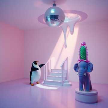 A penguin’s dancing in a disco ball