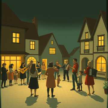 Polish Christmas caroling melody for group singing. Very simple, memorable tune, easy range for everyone. Major key, medium tempo 90–100 BPM. Clear 4/4 rhythm with gentle stomp and claps. Instrumentation: acoustic guitar, folk violin, accordion, light brass accents, simple drums with foot stomps. Mood: joyful, warm, communal, family-friendly. Big sing-along chorus, call-and-response feel. Style: Polish folk-pop, highlander character, live band sound. No autotune, no electronics, organic and festive.