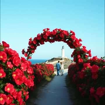 빨간 동백, 파란 하늘, 흰 등대
