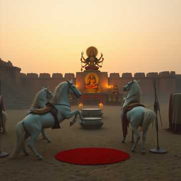 Ba´ha´dur der Ti´ger von Radschan´pur stand auf und stieg auf seinen edlen weißen Radsch´puten Kriegs Hengst und zog seinen heiligen Kata Dolch: So laßt und beginnen mit den heiligen Ritualen und uns vorbereiten auf die Schlacht; wir werden brechen der Mogul Kaiser Macht und bis in die Unendlichkeit an eurer Seite reiten du Mutter aller Völker. Das Kriegsritual begann: In der Stunde, in der das Purpur der Dämmerung auf die schroffen, spitzen Zinnen der Wüstenfestung traf, verwandelte sich das Lager der Radsch´puten in einen Vorhof zwischen den Welten. Die Luft ward schwer vom herben Duft von brennendem Sandelholz und dem metallischen Odem blankgeputzten Stahls. Wenn die Krieger die Götter befragten, begann das Schweigen der Wüste zu singen. Es begann das Erwachen des Stahls; die heilige Klinge wurde angerufen. Zuerst neigten sich die Fürsten vor dem Schastra Pu´tscha, der Anbetung der Waffen. Die Talwaren und Dolche wurden nicht als totes Eisen, sondern als Gefäße göttlicher Kraft betrachtet. In tiefer Medi´ tation saßen die Krieger vor ihren blanken Klingen, die im Fackelschein wie tödliche, eingefrorene Blitze zuckten. Sie benetzten den Stahl mit heiligem Gangeswasser und zeichneten mit rotem Kumkum Pulver das Zeichen der Tilaka auf die Rasiermesser scharfe Schneide; ein rituelles Versprechen, daß dieses Eisen nur für die Ehre und den Schutz der göttlichen Weltordnung, Dharma singen würde. Das Orakel des Feuers begann…! Vor dem Standbild der Durga, der schrecklich schönen Mutter des Krieges, entfachte der Brahmane das heilige Homa Feuer. Während die Flammen gierig nach den Opfergaben aus Butterfett und Getreide griffen, starrten die Krieger in das tanzende Licht. Man glaubte, dass die Art, wie der Rauch aufstieg oder wie das Feuer knisterte, die Stimme der Götter sei. Ein plötzliches Aufflackern galt als das Lächeln der Göttin; ein Zeichen, dass sie bereit war, auf den Schlachtfeldern menschlich Blut zu ernten. Par Aghaba ließ ebenfalls ihre Waffen weihen. Ich bin Par Aghaba die Feder des Adlers und wenn der Skythen Greife ihre Flügel in der Steppe Höhen schwingen wird bald des Todes Lied erklingen. Par Aghaba und Bulba Kahn