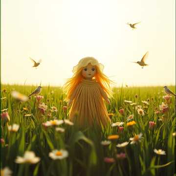 Children’s song, preschool, spring, Polish. Happy, gentle, playful. Acoustic guitar, light percussion, flute, bells. Warm female voice or children’s choir. Theme: farewell to winter, Marzanna doll made of straw and fabric, first day of spring, welcoming spring. Simple melody, medium tempo.